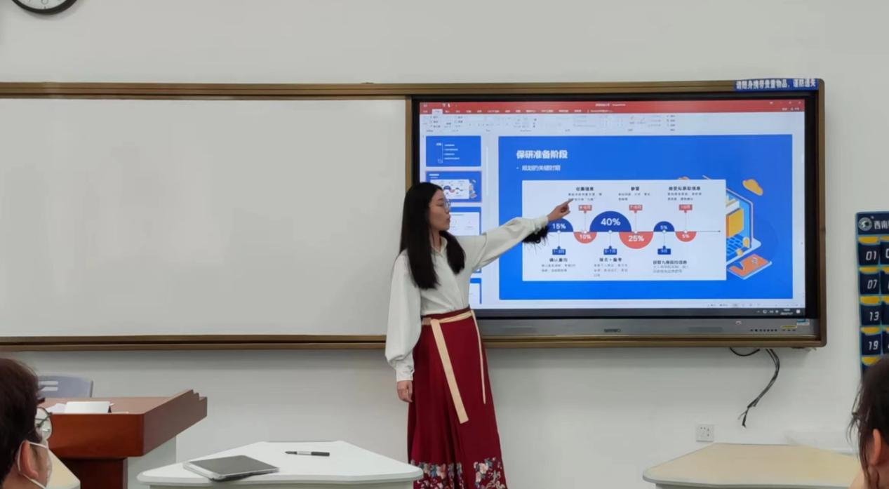 来自金融数学专业的陈佳瑜同学从保研准备阶段、保研申请材料、保研面试技巧、挑战杯学术比赛四方面进行了分享。一是保研准备阶段要熟悉公司和专业的保研政策及条件,参加竞赛和实践活动以提升个人综合素质和竞争力,同时还要建造学术网络。二是保研面试要打造精美的申请材料包,简历上要突出个人优势和成果并准备好推荐信。三是保研面试的学术问题回答要展示学术素养和思维能力,表述好研究计划和目标。最后,她对挑战杯学术比赛进行了介绍,认为参加竞赛可以锻炼自己的团队协作能力和社会责任感,同时也可以丰富自己的个人简历。可以选择参加与自己申请方向相关的竞赛,以展示自己的专业能力和综合素质。