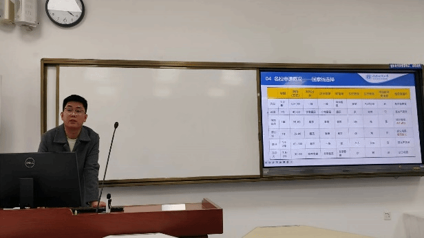 他通过数据展示了近十年高校应届生人数、考研人数和留学人数的逐年上升,展示了2021、2022届毕业生出国留学分布,指出国内优质教育资源存在供需矛盾,而留学在实现个人价值、相对较短的学制、国际化舞台更强的环境等具有多方面的好处。他展示了数学本科常申专业,包括理科、商科、工科和人文社科,让同学们对未来可能申请的专业有大致的了解;讲解了考研留学双保险的时间规划,并对本校的3位出国同学的案例进行了分析;讲解了留学地选择,包括名校申请要素、国家线选择以及时间轴,让同学们可以更早更好地规划;展示了部分录取offer如;悉尼大学、香港中文大学、香港大学、新加坡国立大学等名校,并提供了出国留学预备公司的合作项目和国际处网站。