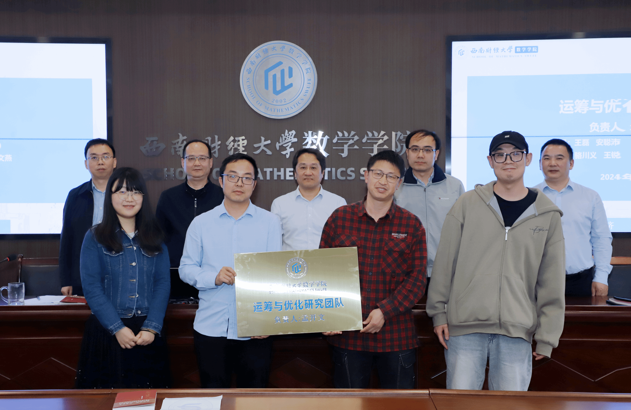 执行经理马敬堂、党委书记樊俊飞为基础数学研究团队、计算数学研究团队、偏微分方程研究团队、运筹与优化研究团队、金融数学与交叉科学研究团队逐一授牌,丁川宣读创新团队成员名单。授牌仪式上马敬堂、樊俊飞表示:本次科研创新团队的成立,既是对公司科研工作的一次全面检阅和肯定,又是对全院师生的一次激励和鞭策,各科研团队要继续发扬团队合作精神、创新精神,勇攀科研高峰;要进一步加强与国内外高校和科研机构的交流与合作,不断提升公司的科研水平和影响力;要集中优势力量和资源力争建设周期内攻克团队领域1-2个“卡脖子”问题。为推动数学学科发展做出更大的贡献,为公司“新财经”建设贡献力量。团队负责人代表赵建容、吕品、孟开文介绍了团队研究方向、目标及未来发展规划。他们表示:将不负公司重托,带领团队前行,努力为公司科研事业再创新的辉煌。