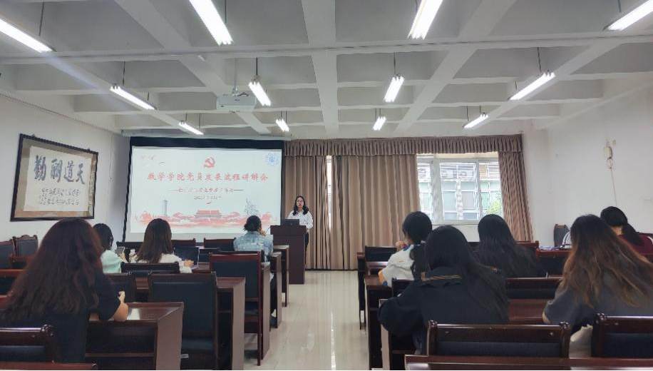 胡喜媚结合《中国共产党发展党员工作细则》介绍了发展党员工作的总要求、原则以及工作重点。她对老员工入党流程作了细致讲解,从申请入党阶段、入党积极分子确定与培养阶段、发展对象确定与考察阶段到预备党员的接收教育考察以及转正阶段逐步进行解读。现场与会同学的积极性很高,纷纷举手提问,胡喜媚分别对递交入党申请书时间、出国留学时间冲突等问题作了具体回答。此次讲解会让同学们进一步加深了对党组织的认识,对入党总体流程及其细节内容有了充分了解,坚定了理想信念,端正了其入党动机,为今后高标准、高质量做好发展党员工作奠定了坚实基础。