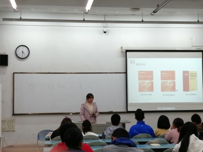 率先介绍的姜浩博同学主要分享了自己数学学习上的经历,为同学们推荐了时间分配方法,详细说明自己对数学与经济学两门学科的理解;刘诗琦同学则为同学们推荐了备考方针,并且推荐了学习所用的书籍,同时强调了平时学习的重要性。