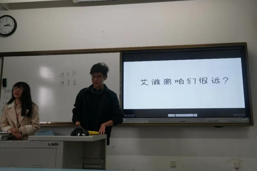 本次讲座主讲人从以下三个方面展开:艾滋病的传播途径、艾滋病易感染人群和感染方式、有效预防艾滋病的正确做法,使同学们了解到我国艾滋病病情发展的大体现状,意识到预防艾滋病的可行性与必要性。讲座过程中,许露同学采用了游戏导入的新颖形式,以图文结合讲解的形式为主,列举了艾滋病感染人群年龄段分布,青少年艾滋病发病率等严谨直观的数据,详细说明了青少年艾滋病发病率日渐增长的严峻趋势,并讲授了艾滋病防治的有效措施和日常生活中的注意事项。