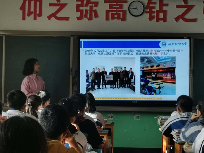 实践队伍走进高中校园,与老师同学面对面,分享大学精彩生活,讲述来到西财之后的改变,介绍西财的优势及特色。