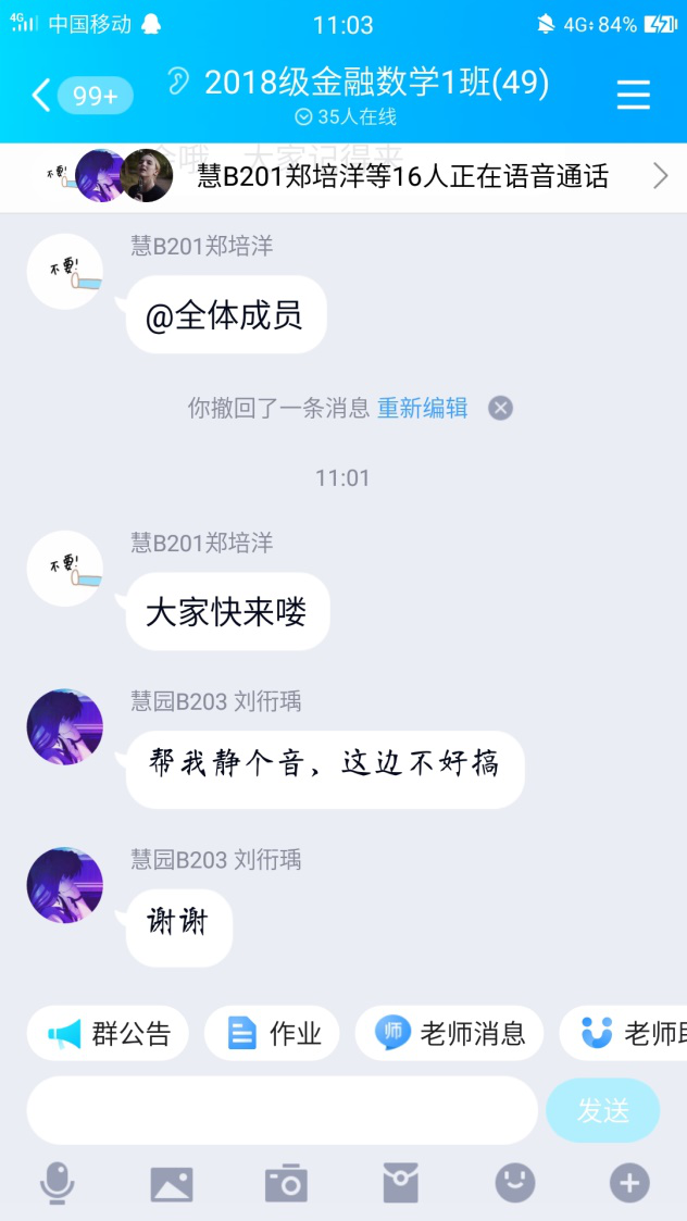 针对在疫情期间同学们不能够很好的安排好自己的学习生活和规律作息,而导致的情绪不调失控等问题,2020年4月24日11点,2018级金融数学1班在班群里开展了以面对疫情多自省为主题的班会课。