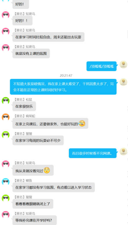 通过本次班会,心理委员了解到同学们的困惑大致都与懒散、效率低、爱拖延、没动力、容易被打扰有关。而许多同学都难以找到比较有效的解决方法。但通过此次活动,同学们能够在线上互相分享更又有效更健康的学习方法和居家活动,促进同学们反思过去,更好地改善自己的作息习惯和居家心态。