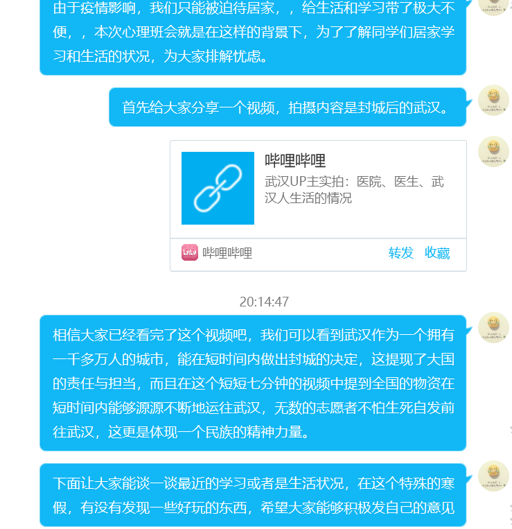通过本次线上心理班会,让班级同学能够了解到彼此的学习和生活状态,让大家明白这种紧张的心情是一种正常的表现,让大家能以一种积极乐观的心态去面对它,而不是选择回避。班级同学的分享和自我的反省一定程度上排解了大家紧张焦虑的情绪,让同学们能更好的适应当下居家的生活。