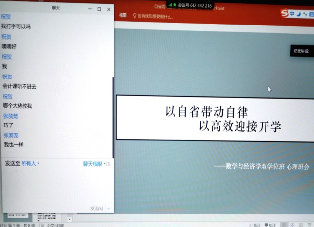 疫情尚未结束,同学们因为长时间的网课出现了效率低下,知识点掌握不牢等多种学习问题,有些同学也因此感到十分焦虑不安。为了帮助同学们解决此类困扰,五月一日晚,2019级经济数学班召开了以“以自省带动自律,以高效迎接开学”为主题的线上心理班会,共40名同学参加,班会上大家相聚分享好的习惯与方法,解决共同的烦恼。