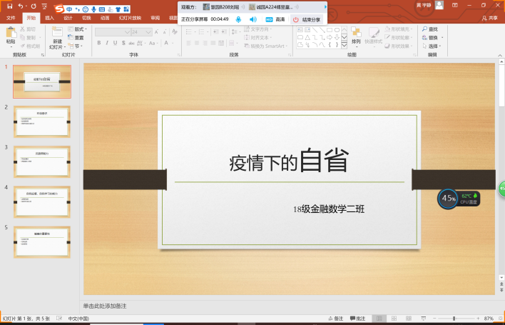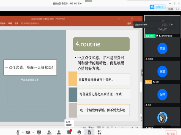 2020年5月9日,2017级金融数学一班积极开展了以“自我反省 及时止损”为主题的心理班会。疫情期间的特殊情况下,本次班会在“腾讯会议”平台进行,由心理委员马甄同学与团支书刘玥同学主持。