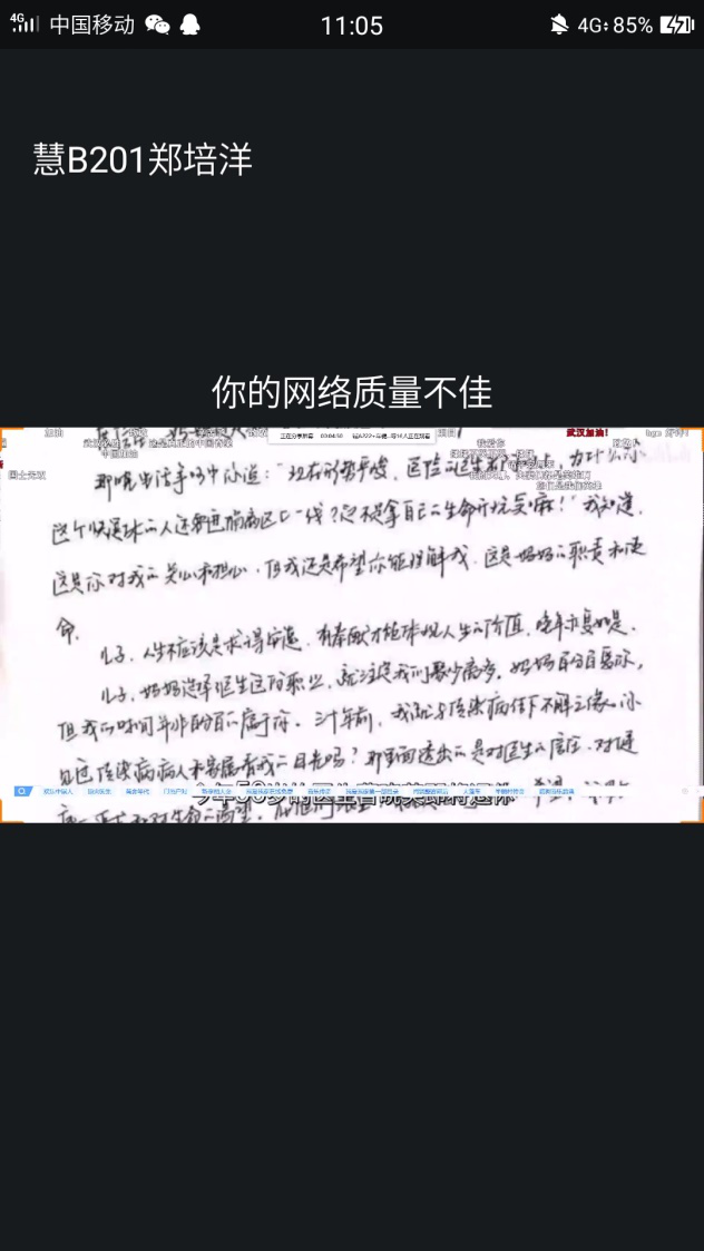本次活动以观看视频开始,心理委员和大家分享了一个有关武汉封城后武汉人的生活情况的视频,视频中武汉人民并没有自暴自弃,一切都在按部就班的进行,让同学们体会到我们国家自强不息的精神力量。