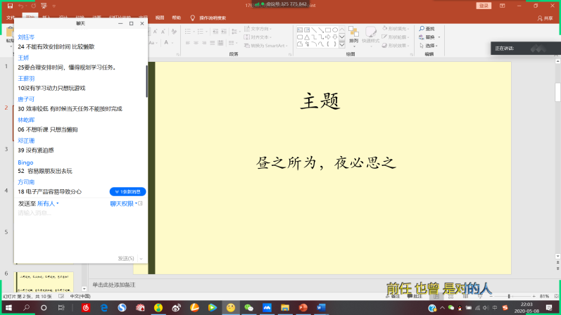 首先,心理委员选择了林逋《省心录》中五条语录分享给同学们,并进行了简单的讲解。同时,同学们思考自己宅家学习生活中遇到的困难疑惑,并分享在腾讯会议的聊天面板上。针对这些困惑,心理委员让同学们分享自己对其中某一个或一些问题给出自己的解决方法,最后,心理委员同学对同学们的发言结合分享的语录进行了总结。