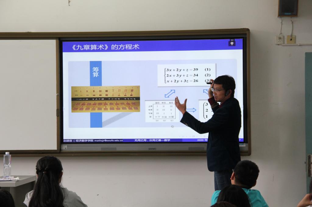 本次讲座赵建容教授以“无用之用,众用之基”为主题,从数学无用谬论引入话题:如何用数学解决实际问题。然后从古到今两个维度详细阐述数学之用:在古代数学部分,赵建容教授列举大禹数学治水、管仲数学治国,商高测量术以及《九章算术》等例子讲述了数学的实用性;在现代数学部分,赵建容教授又列举了华罗庚巧用黄金分割、芯片技术中的数学力量等例子阐述数学在科学技术上的广泛利用。赵建容教授用幽默的语言向同学展示了数学的有用之道,激发了同学们的极大兴趣。最后,赵建容教授提出了总结与期望:树立学习数学的信心,提高利用数学解决专业问题的能力。同学们也积极地和赵教授互动,提出了数学学习过程中的疑问和思考。