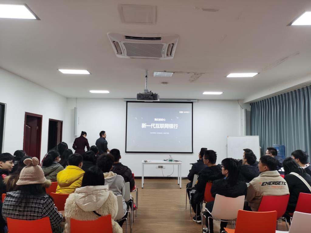新网银行创立于2016年12月28日,是四川首家民营银行也是中西部首家互联网银行。新网银行带领公司师生参观了银行总部工作环境,并且从互联网大数据风控、云计算、人工智能等技术方面向公司师生介绍了其作为互联网银行的特色,详细介绍了新的互联网技术在普惠金融中的创新和运用。此外,银行人力资源李佳潞经理从校企合作、校园招聘等方面详细介绍了银行的用人需求和招聘方式,欢迎同学们加入新网银行实习、工作。公司员工对于新网银行的运营模式和业务打造兴趣非常浓厚,就互联网银行在风险控制等方面提出了诸多问题,新网银行进行了一一解答。