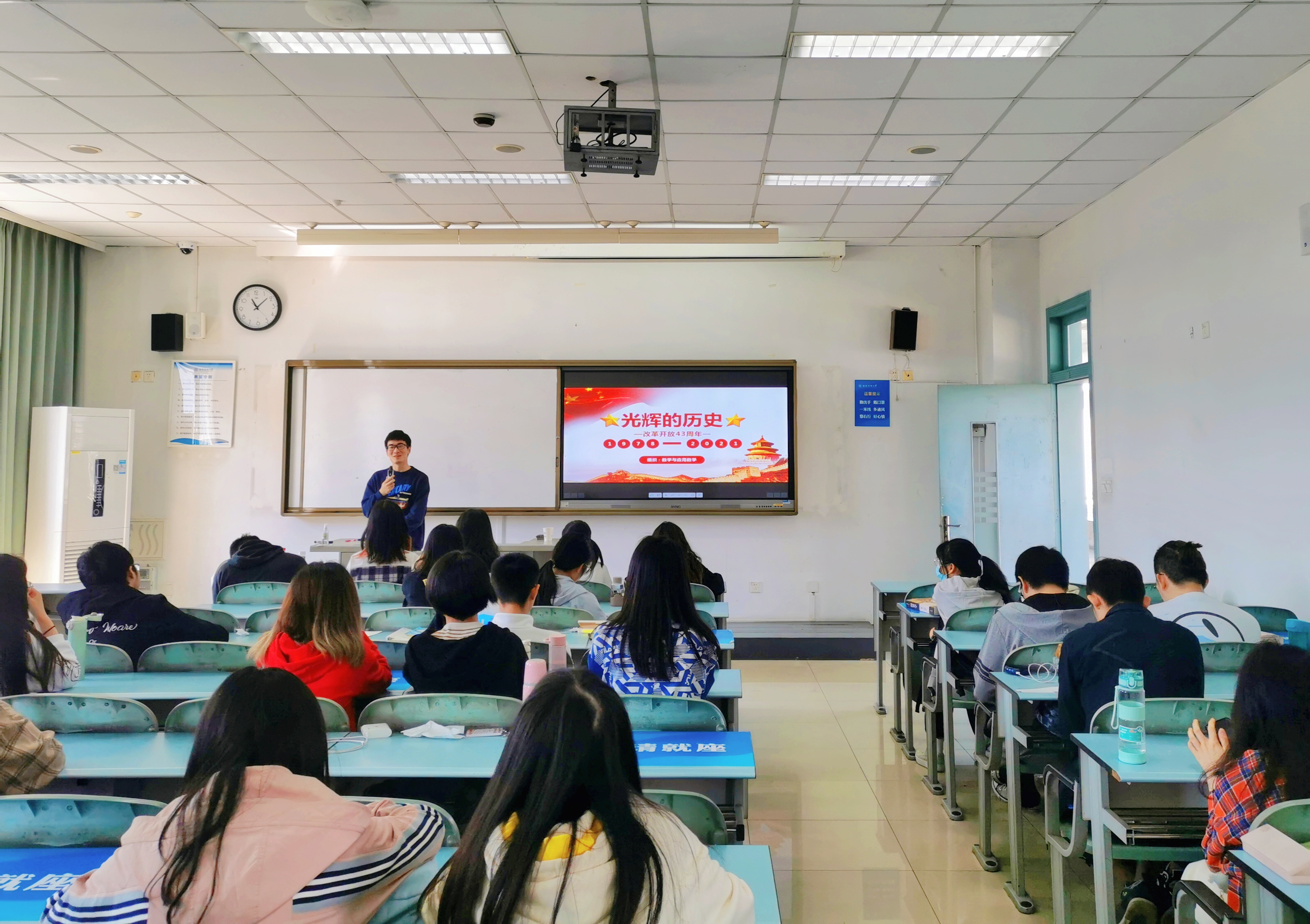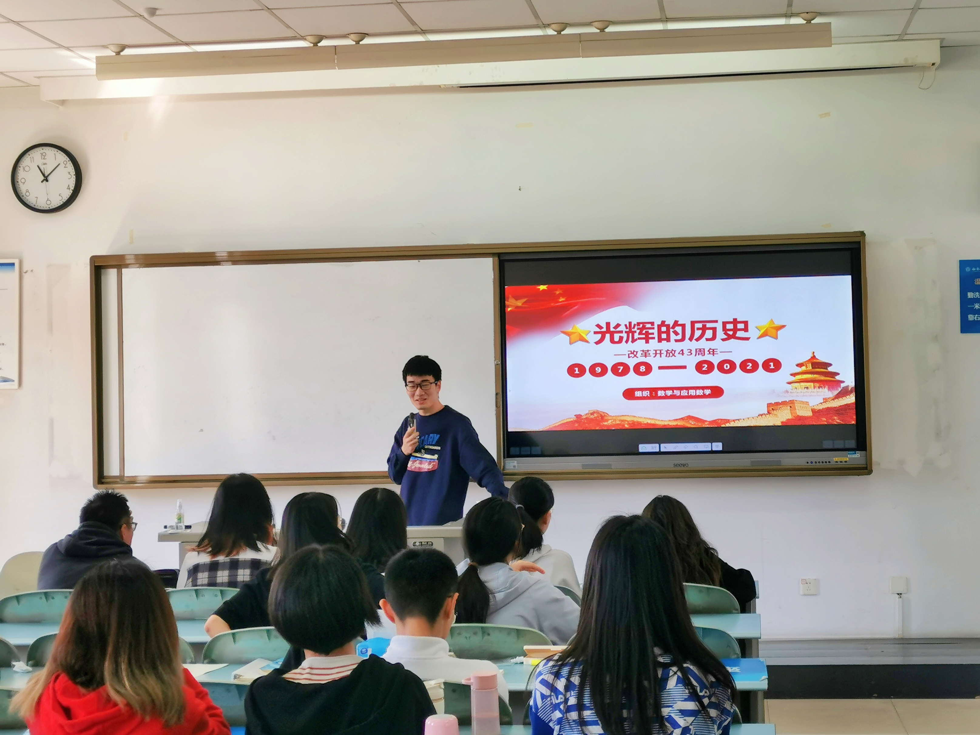 学习百年党史,汲取奋进力量。2021年4月29日,经济2019级数学与应用数学(数学与经济学双学位班)在经世楼C503教室开展“学党史、强信念、跟党走”主题班会,班长何易纯带领全体同学深入了解并学习改革开放史。