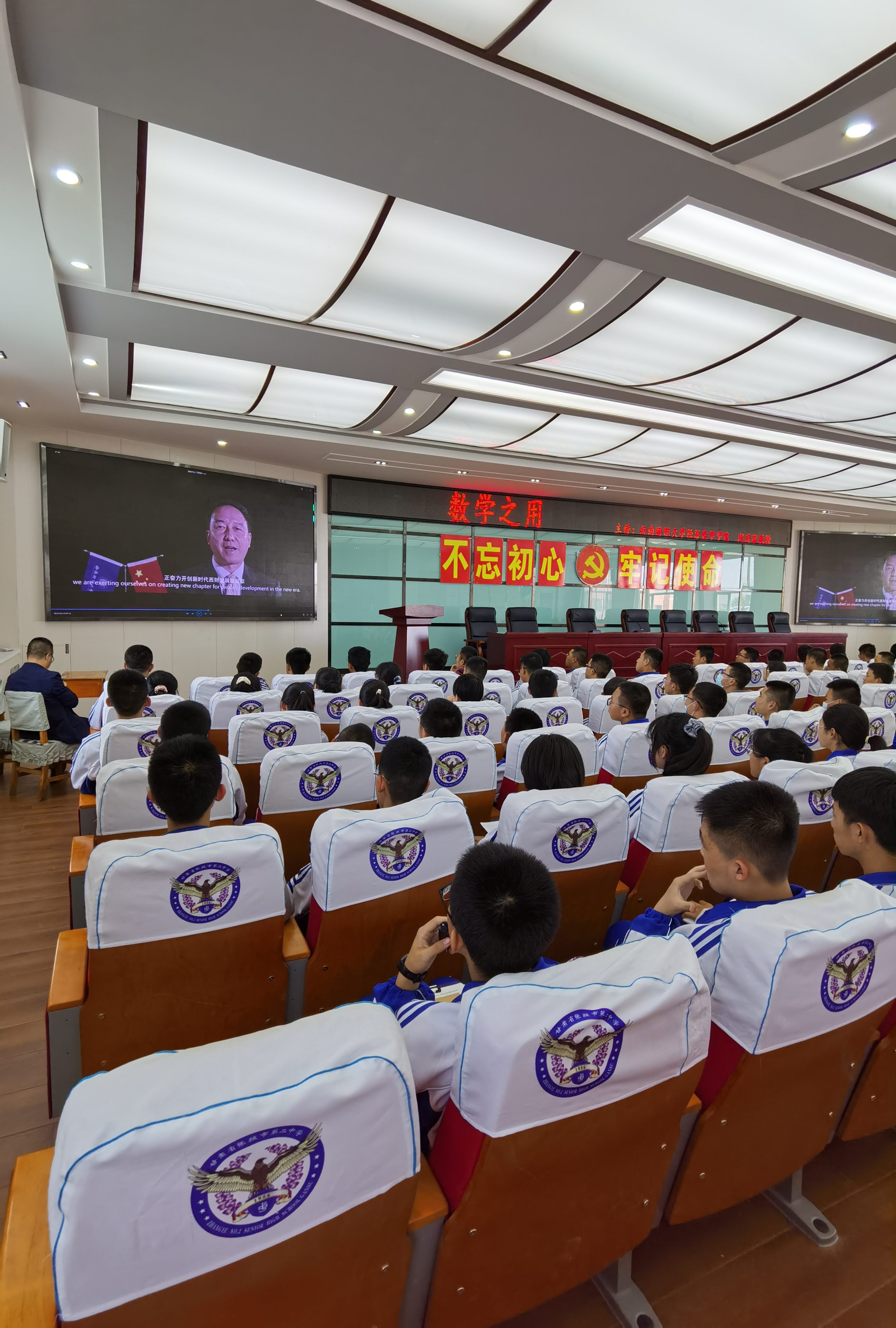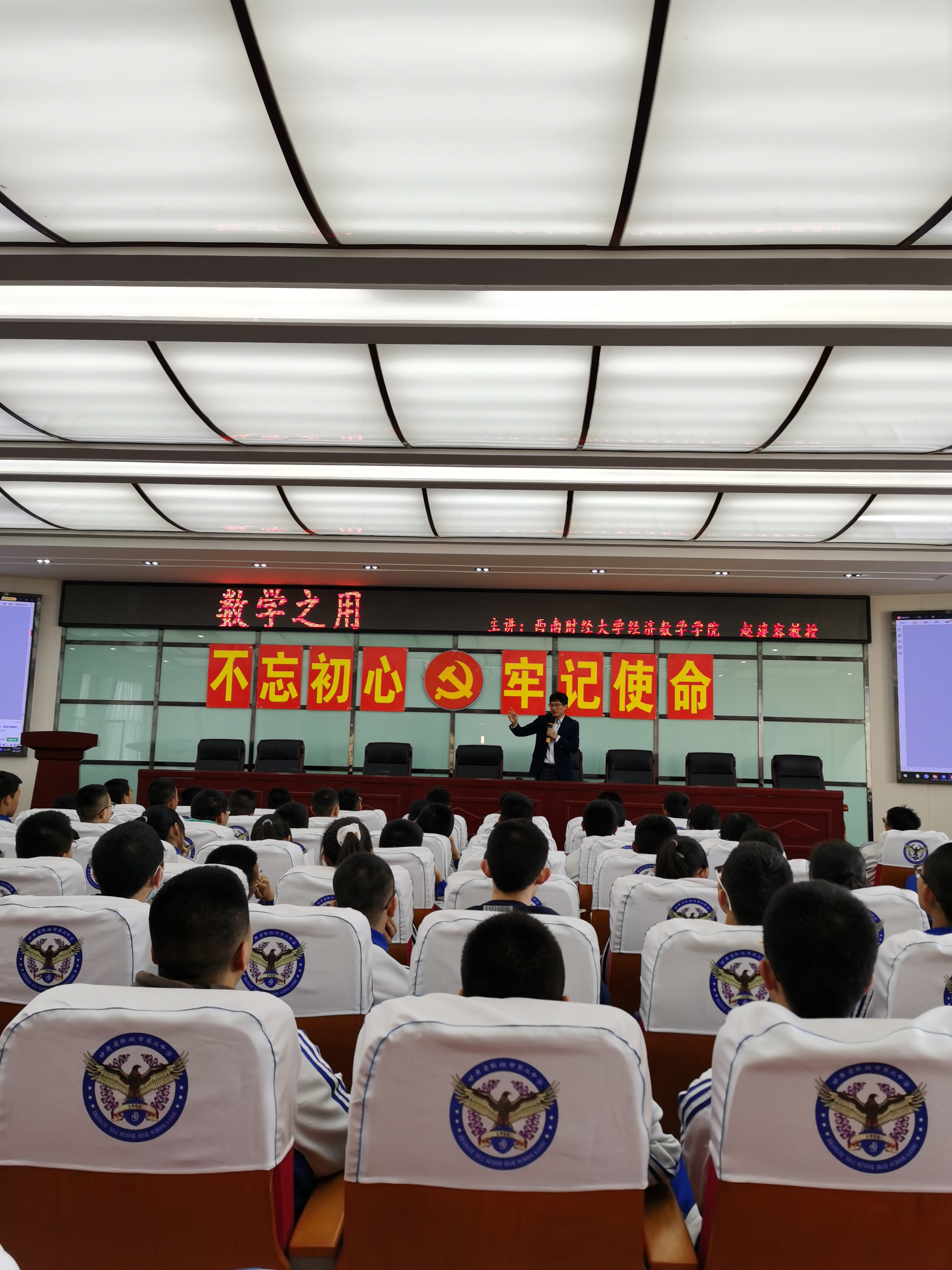 5月7日,招生宣传小组人员赴张掖第二中学举行tyc5997太阳集团“优质生源基地”签约挂牌仪式。仪式上,中学师生一起观看了tyc5997太阳集团宣传片,随后,赵建容教授为高一、高二学子做了题为《数学之用》的讲座。