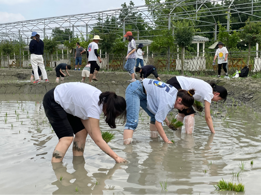 当日下午13:00,同学们乘车赶往校外劳动教育基地。到达目的地后,基地负责人向同学们讲解了秧苗的特点、种植的注意事项,并示范了如何进行插秧等具体的前期准备工作。随后,同学们在带队老师的指导下,有条不紊地分组完成分配任务。同学们挽起裤腿,露出胳膊,在将近三十摄氏度的高温下不惧酷暑,下田插秧。还有部分同学舍弃了防护工具,直接体验了“面朝黄土背朝天”的劳作活动。在一个半小时的辛勤劳动中,同学们不惧烈日、互帮互助、艰苦劳作,顺利地完成了四片水田的插秧目标。