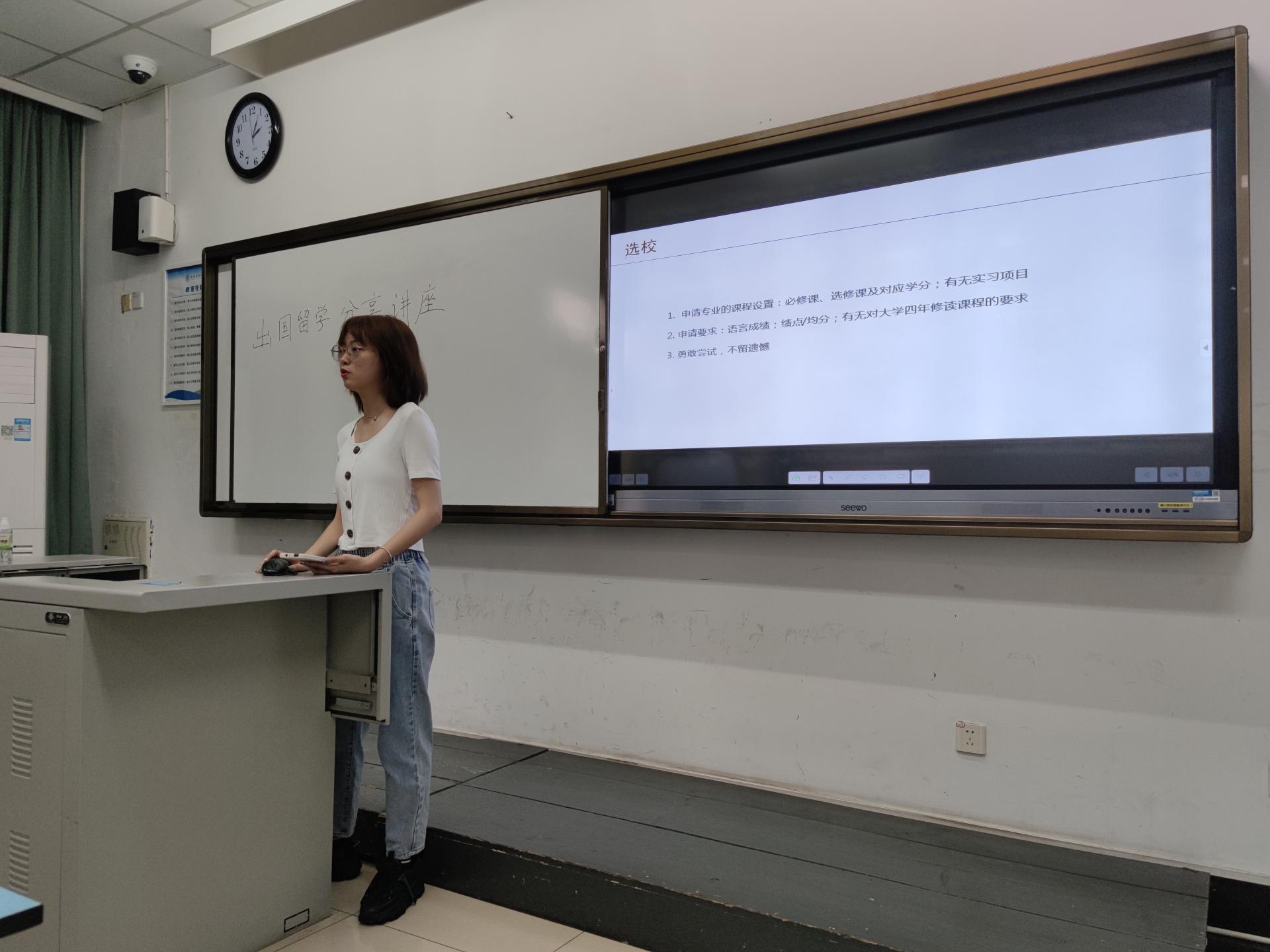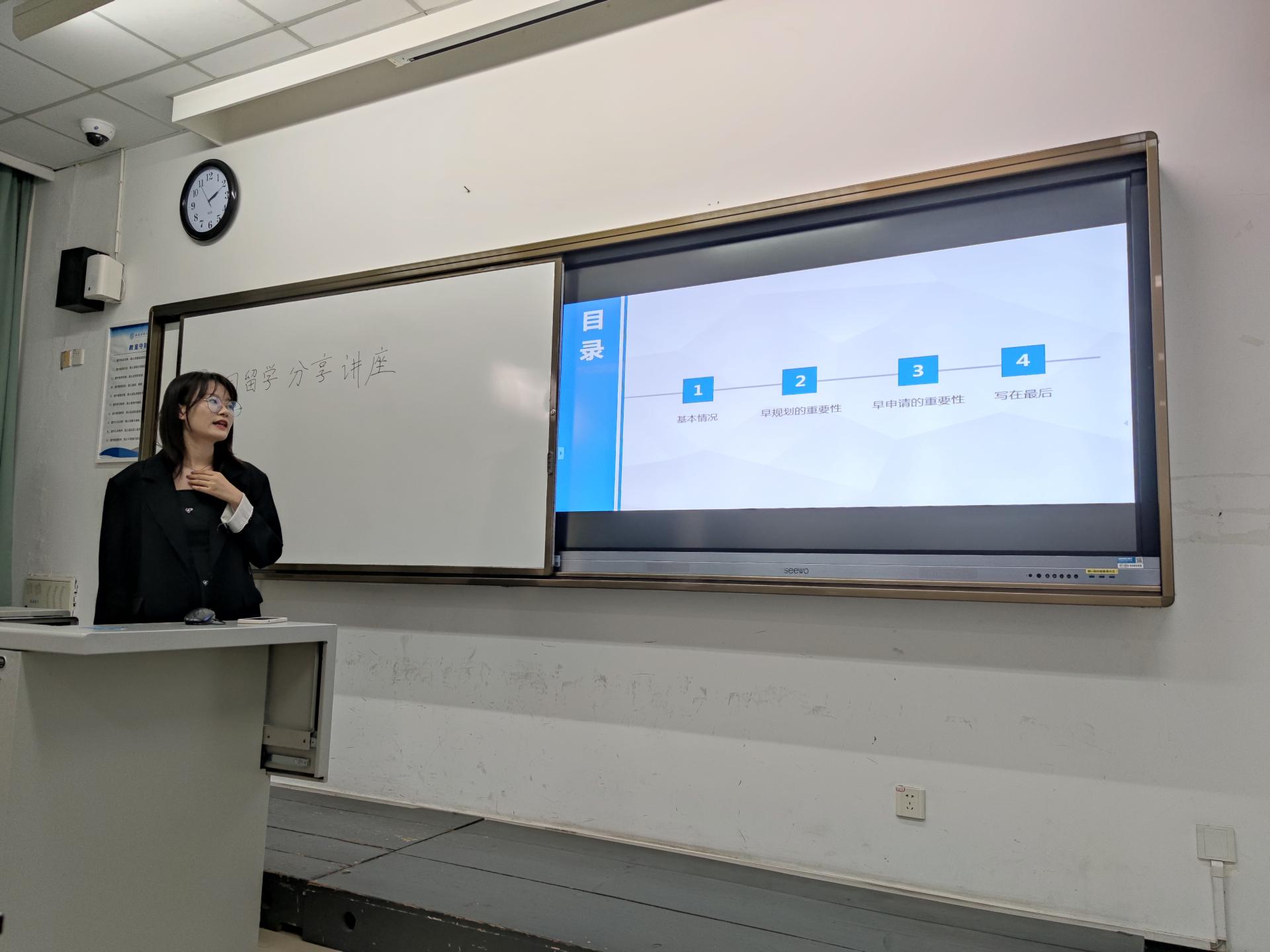 讲座中,两位主讲人就自己成功申请留学的经历同大家进行了详细的分享。首先,王雨薇同学为大家详细讲解了留学申请的整个过程,强调了在公司专业选择、申请文书制作以及材料投递时间等方面需要注意的地方。在公司专业选择上,王雨薇同学提出要提前了解各海外大学的专业课程设置,并将其对绩点、语言成绩、实习、科研等方面的要求同自身条件进行比较,在此基础上做出选择;在申请文书方面,王雨薇同学强调要按相关要求准备齐全,并针对不同的公司专业准备不同的申请文书。夏潇湘同学则着重说明了早规划和早申请的重要性。在早规划上,夏潇湘同学认为在不同的时间段要做好相应的准备,从学业、比赛、实习等方面使自己在留学申请上更具有竞争力。在早申请上,夏潇湘同学提到一般越早申请国外的大学,竞争越小。最后,两位同学也对大家提出的问题进行了详尽的解答,并以“昨日种种,皆成今我”鼓励同学们努力追求自己的留学梦想。