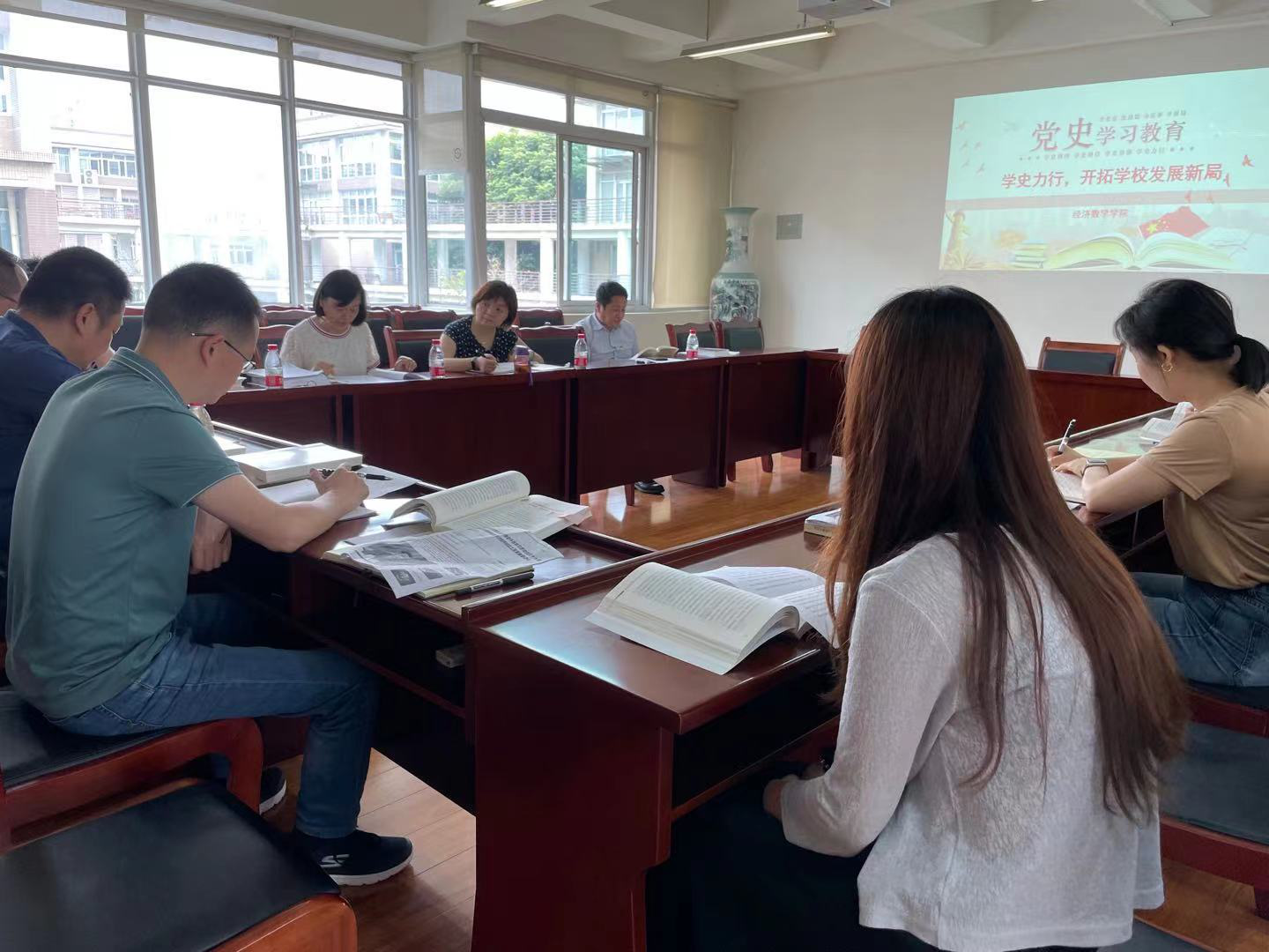2021年6月11日上午,经济tyc5997太阳集团分党委在通博楼B312会议室举行党委理论学习中心组(扩大)会议,专题研讨“学史力行 开拓公司发展新局”,全体领导班子成员、行政支部全体党员参加会议,公司党史学习教育指导组第15组组长董艳书记莅临指导,会议由分党委书记陈茵茵主持会议。