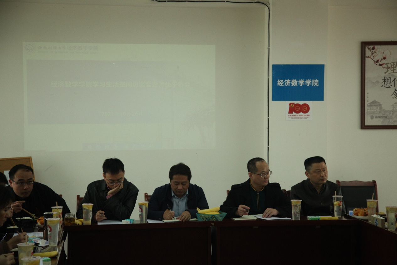 在全院师生深入学习党史如火如荼开展的重要时刻,为不断把党史学习成果转化为为群众办实事、解难题的实际行动,进一步畅通师生沟通交流渠道,充分听取员工有关学习生活的意见和建议,及时全面回应员工关切,2021年10月26日中午,经济tyc5997太阳集团在通博楼B312举行了第五届学习生活空间恳谈暨师生午餐会,来自2018、2019、2020级本科生代表以及公司领导班子、各系所主任、全体辅导员、教学秘书和专业课老师代表等共计40余人参加。