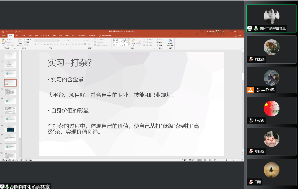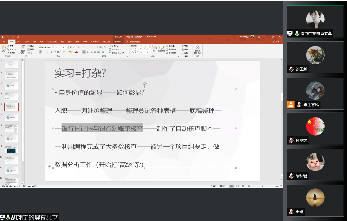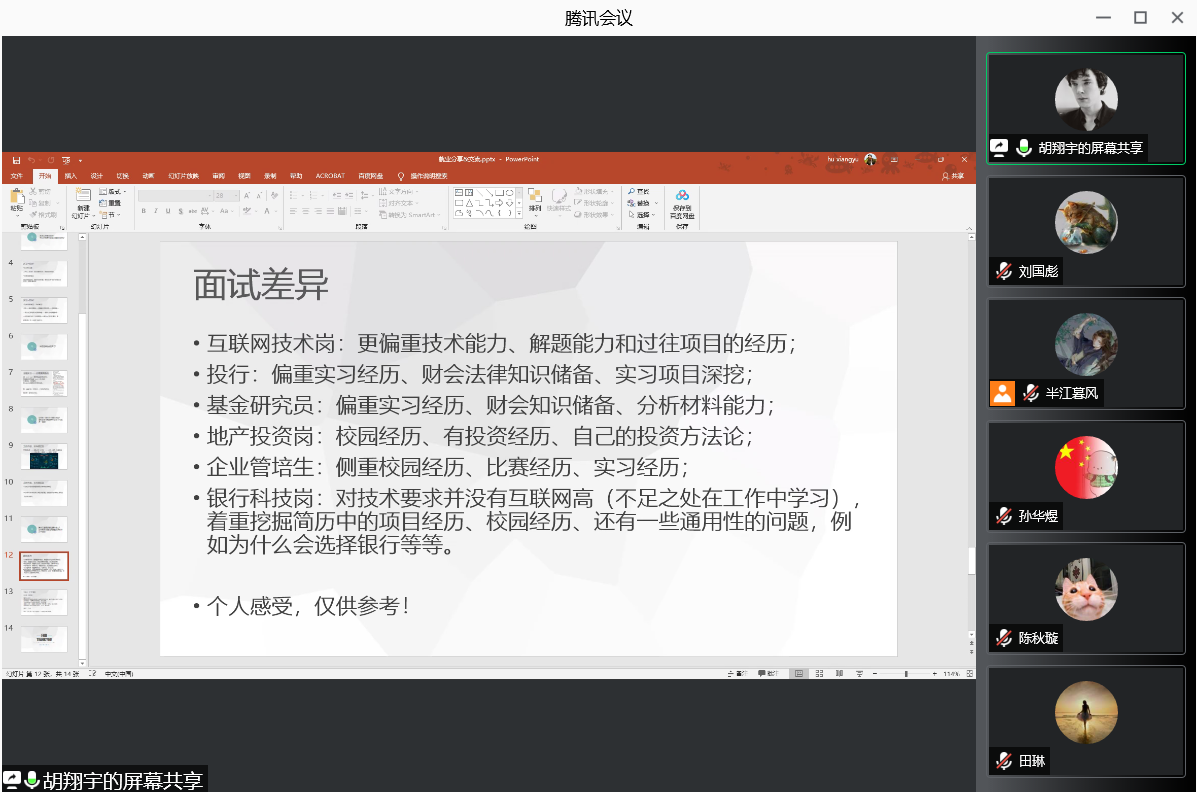 胡翔宇首先根据同学们的提出的问题,结合自己的实习、就业经历展开了分享,以切身经历向同学们展示了真实的求职之路。他强调保持对职场正确的认识,明晰选择的方向的重要性并向同学们提出了努力提高自己专业素养、坚持学习计算机类课程等几点规划建议。同时针对同学们关注较多的问题,如针对如何找实习、如何在实习中实现价值创造、本硕就业的区别以及企业和银行面试所侧重区别等方面分享了自己的理解与看法。李逸凡结合自己大学的学习经历,主要分享了关于如何平衡课外实践、专业学习和工作实习压力的问题,并对同学们提出了本科生一定要坚持学习的要求。主讲人分享结束后,参会同学现场提出了自己对于未来职业发展与生活的迷茫和困惑,六位主讲人都耐心地结合自身经历进行逐一回应,力求减少同学们对于未来地茫然无措、扩展同学们对于职场地认识。最后,他们强调同学们在大学中夯实专业基础,拥有扎实的基本功,同时要学会在工作中积极思考,在激烈的职业竞争中脱颖而出,避免无必要的彷徨。