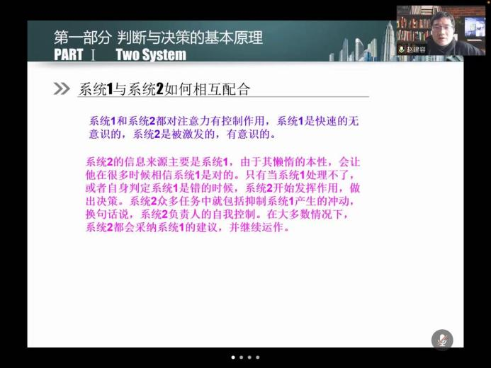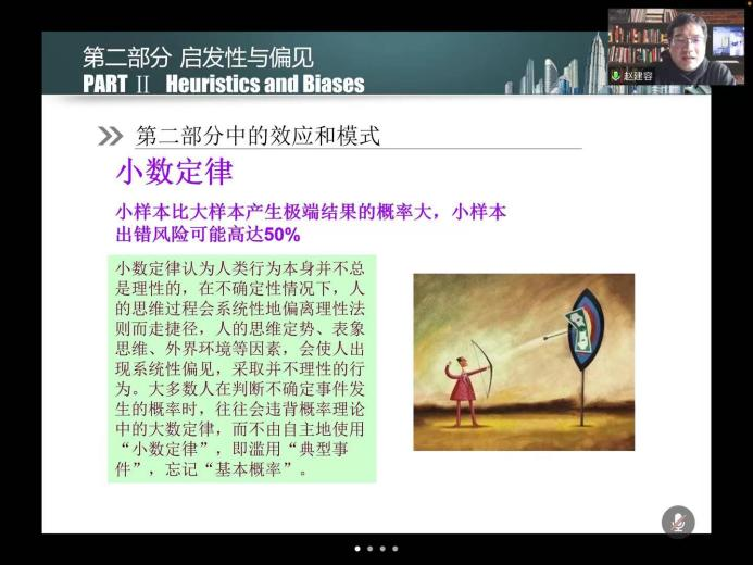 活动采用腾讯会议线上开展,首先,赵建容教授介绍了书籍《思考,快与慢》及其作者丹尼尔·卡尼曼。他说到,《思考,快与慢》是一本关于思考和决策的哲学书,其作者丹尼尔·卡尼曼也是2002年诺贝尔经济学奖获得者。接着,赵建容教授向同学们抛出了几个问题:1、探讨书中思考和决策模式与效应的对与错。2、我们应该如何去避免这些模式错误。3、讨论如何利用别人容易在这些模式上的错误创造更多机会,或者在竞争中取胜。随后,赵建容教授分享了自己对该本书的理解,第一部分讲述判断与决策的基本原理,主要包括对系统1、系统2的阐述和光环效应。第二部分讲述启发性与偏见,主要包括小数定律、锚定效应、可得性偏见、回归现象。第三部分讲述过度自信的相关内容,包括结果偏见、乐观偏见。第四部分讲述选择问题,包括前景理论、禀赋效应。最后赵建容教授希望同学们在今后的生活里热烈但不偏激,坚信却不盲从,接受美好但不完美的生活和自己。