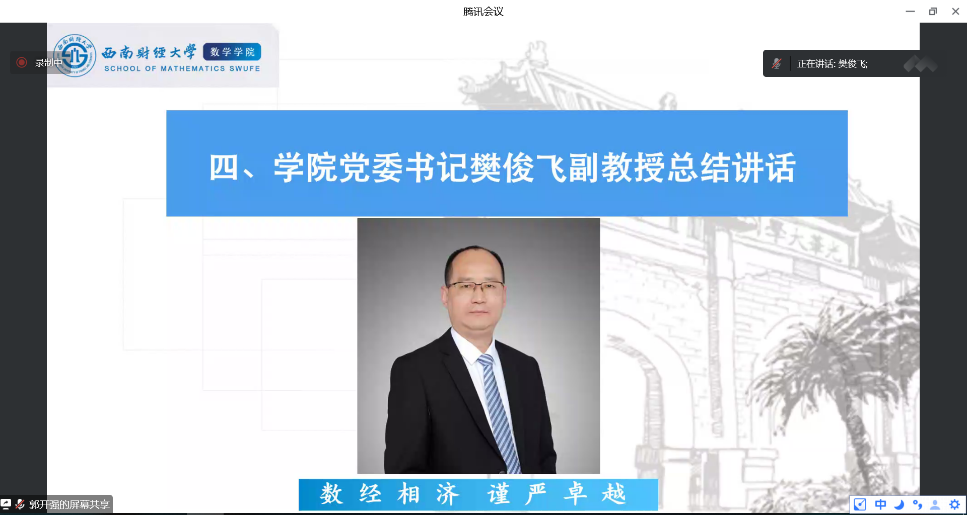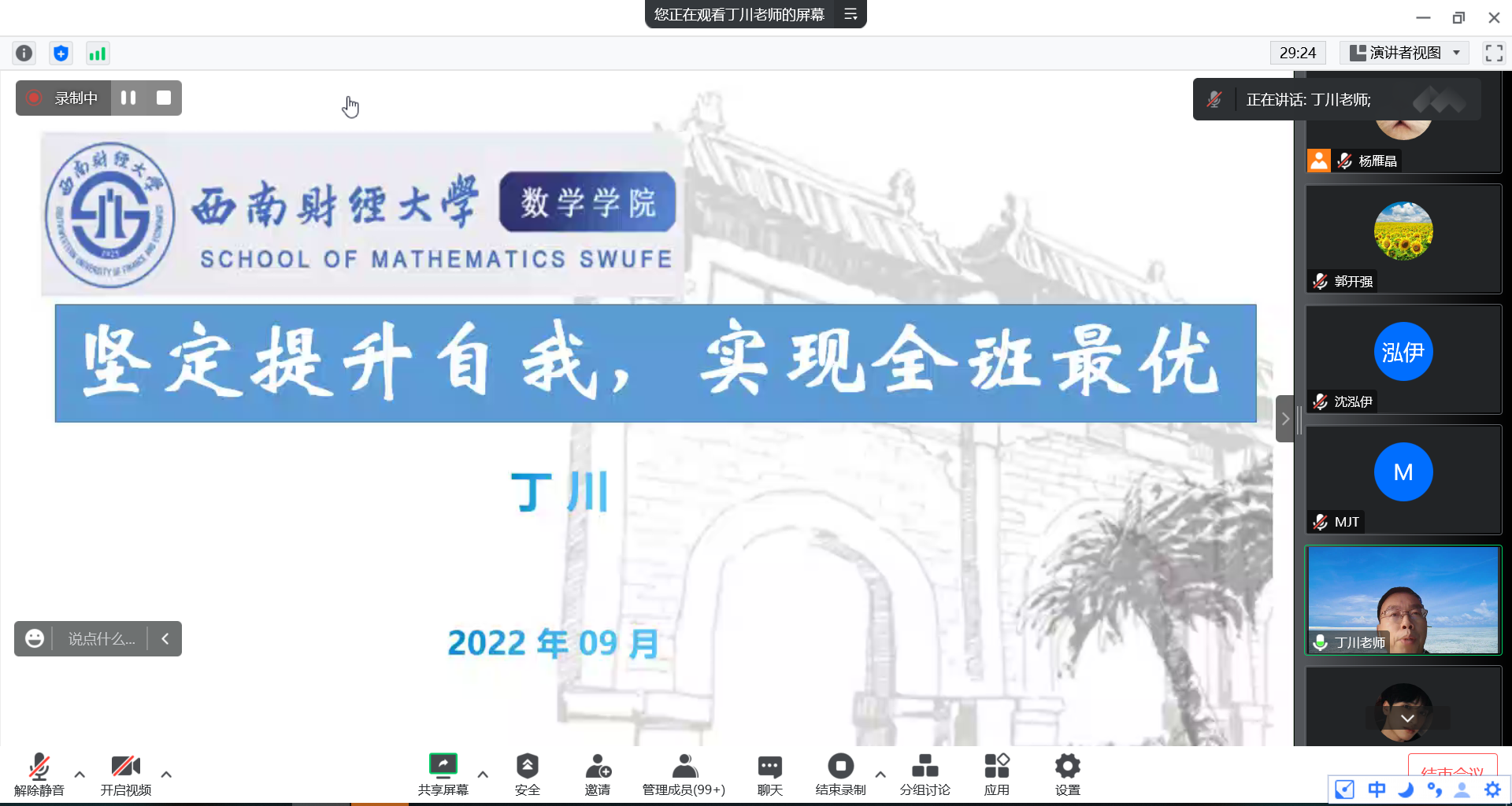公司副经理丁川教授以“坚定提升自我,实现全班最优”为题,从“难”“悟”两个字为切入点寄语2021级本科同学。他希望同学们面对“难”,要多“悟”,悟专业知识、悟为人处世,做一个有扎实学识、有情感温度的人。同时,丁川教授还介绍了“数学+”专业的优势、公司进一步深造情况、公司的保研细则等内容。