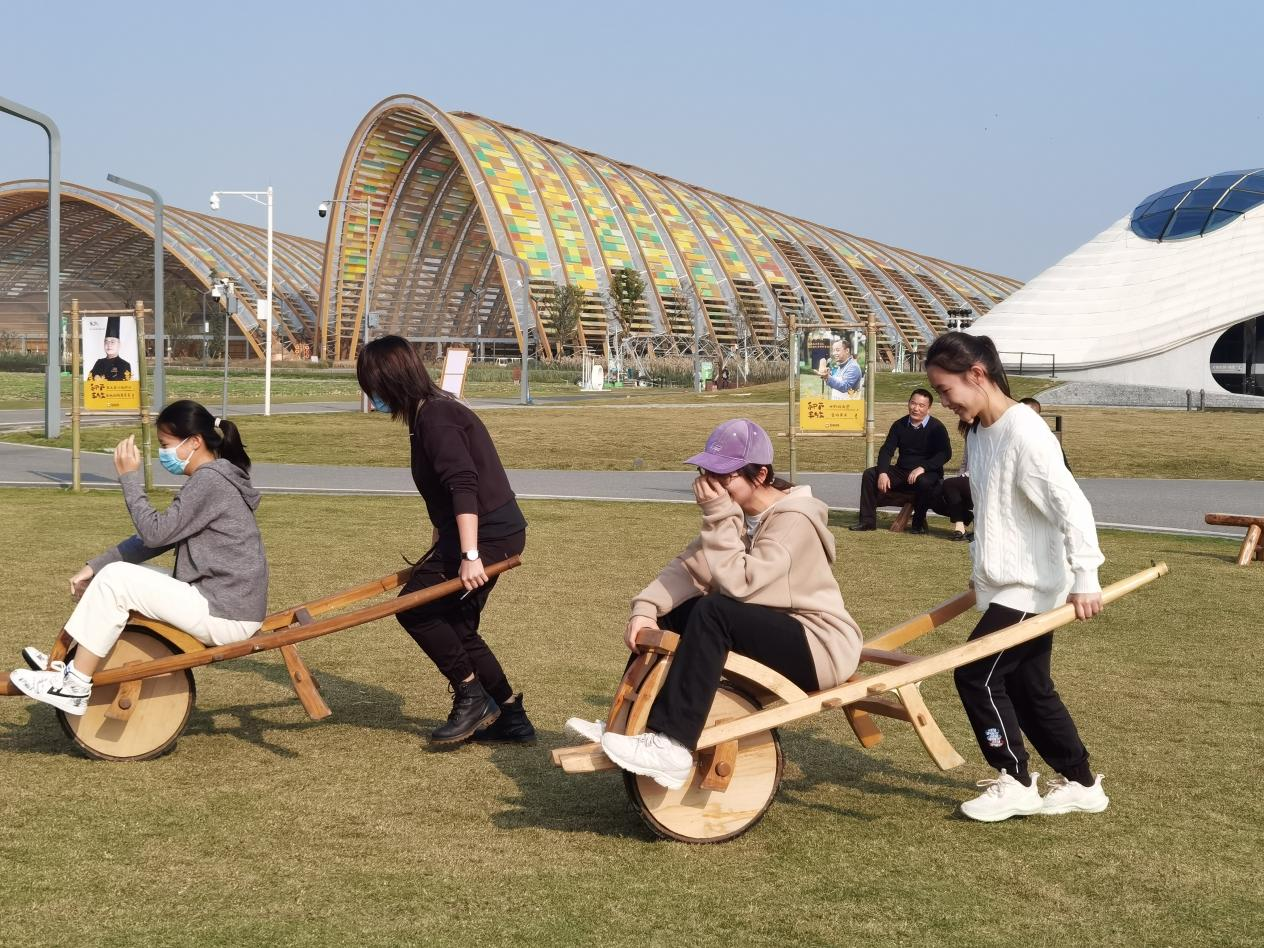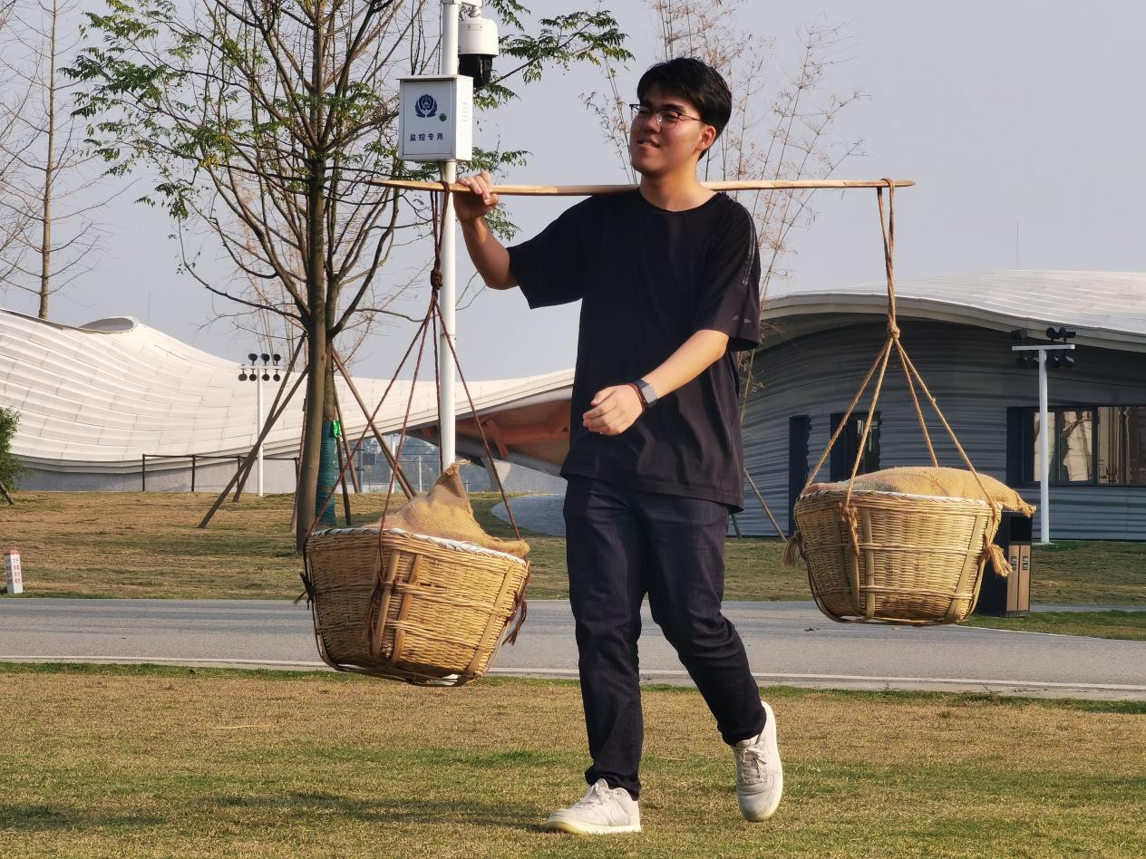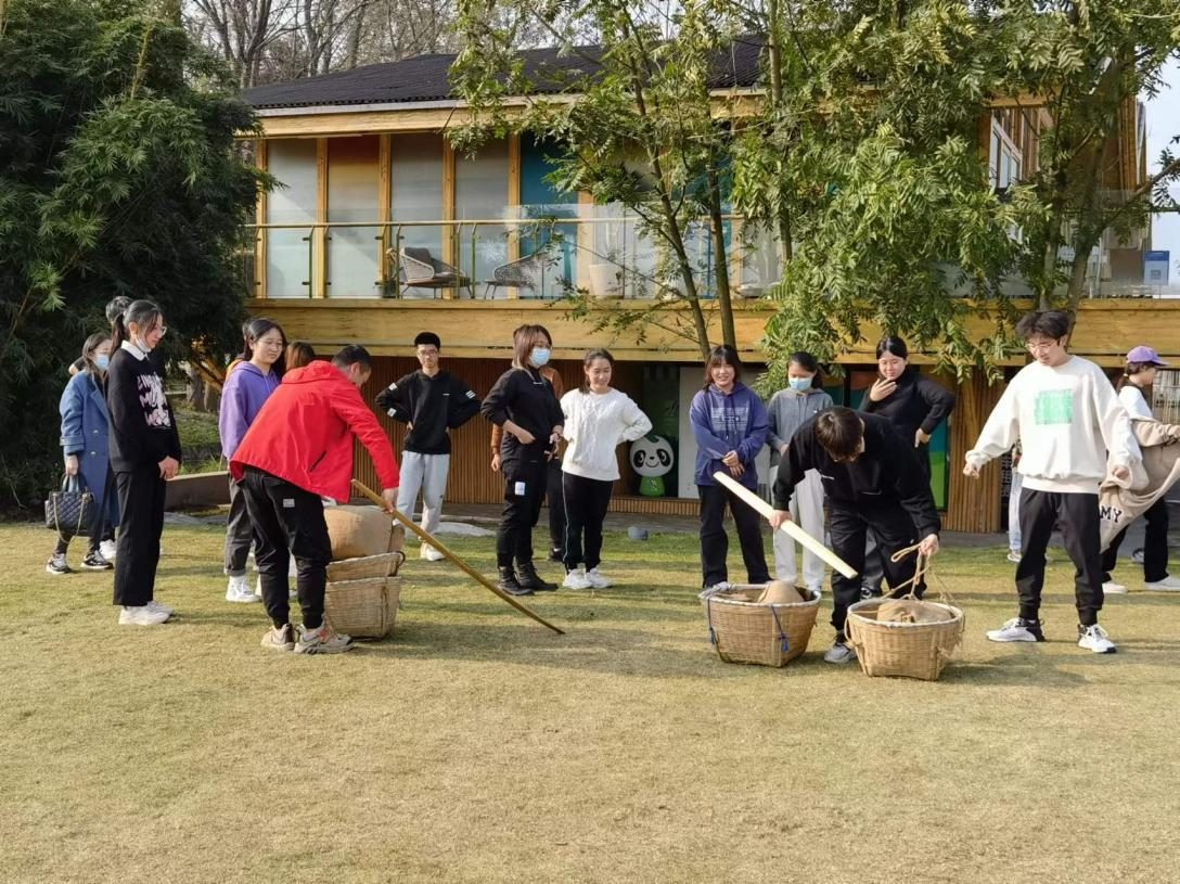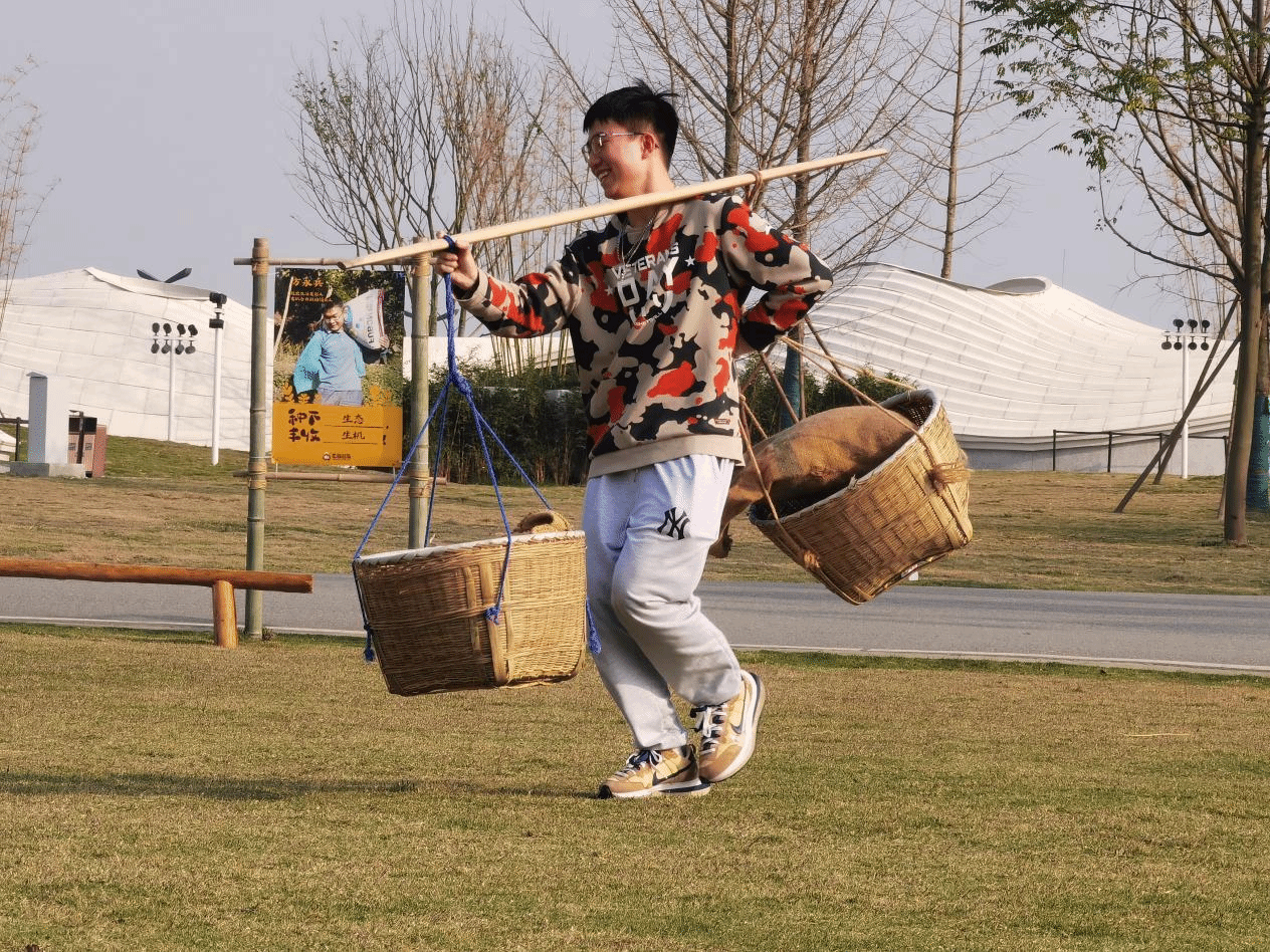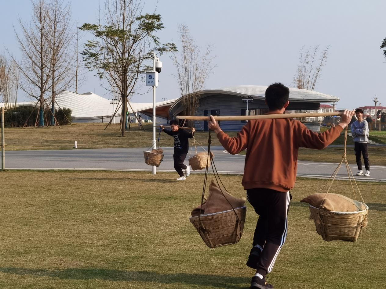 随后,同学们步行至活动草坪上参加农业运动会。18名同学分为两组进行对抗,依次进行了推鸡公车、挑担子、接力传球等趣味活动。大家积极配合、团结协作,在活动中更深刻地体会到了劳动人民在耕种时的不易,用心感受了中华农耕文明的源远流长。
