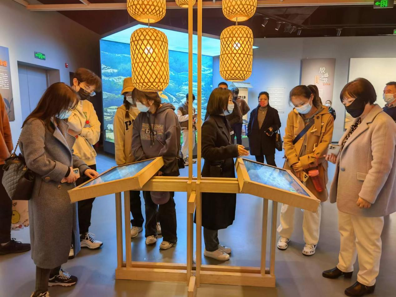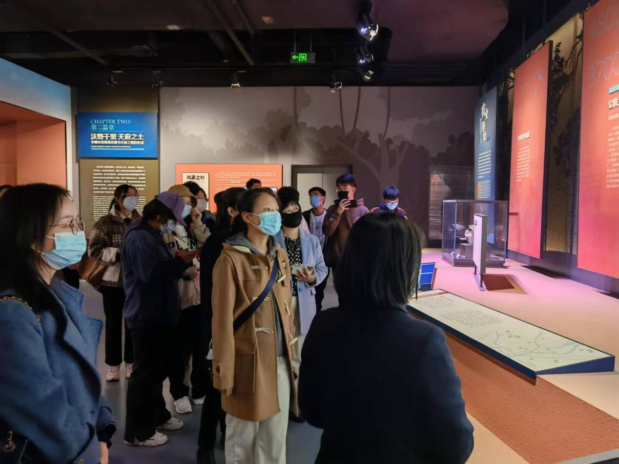 农博主展馆分3个展馆——中华农耕文明馆、大国粮仓科技馆和脱贫攻坚成果综合展示馆。同学们主要参观了中华农耕文明馆,这也是2022年中国农民丰收节组委会设置的永久性展馆,包括天府农耕文明主题展览、国宝与丰收主题展览等。主题展览分为5大篇章:四川的地理气候环境、旧新石器时代农业发展到天府之国形成、天府农耕文明的兴盛与成就、天府农耕文明的跌宕起伏、近代四川农业。讲解员详细介绍了中华农耕文明跨越5000年的发展历程。最吸引大家的是,在每一处都有视频讲解和3D模型,比如都江堰水利工程,会有对鱼嘴分水堤、飞沙堰溢洪道、宝瓶口进水口三大部分的解说,模型上的丰水期和枯水期态势栩栩如生。在讲解老师的精彩介绍中,同学们被中华农耕文明的博大精深所深深折服。
