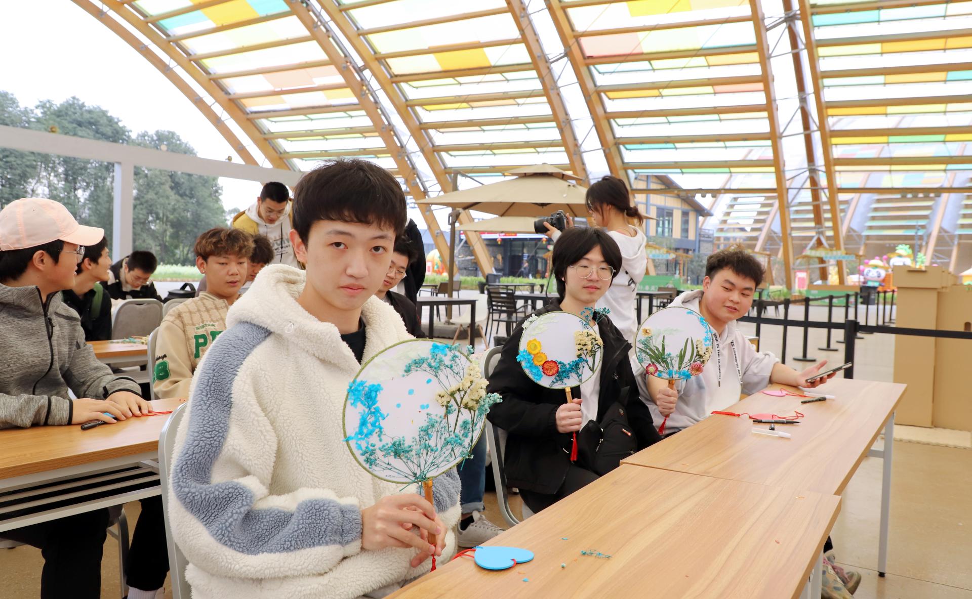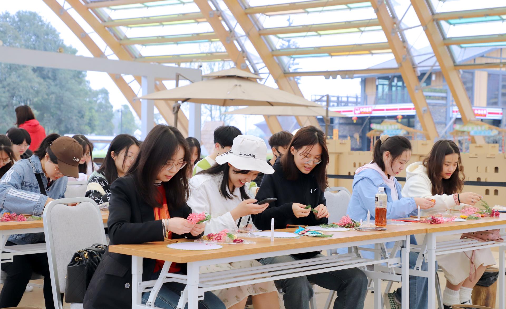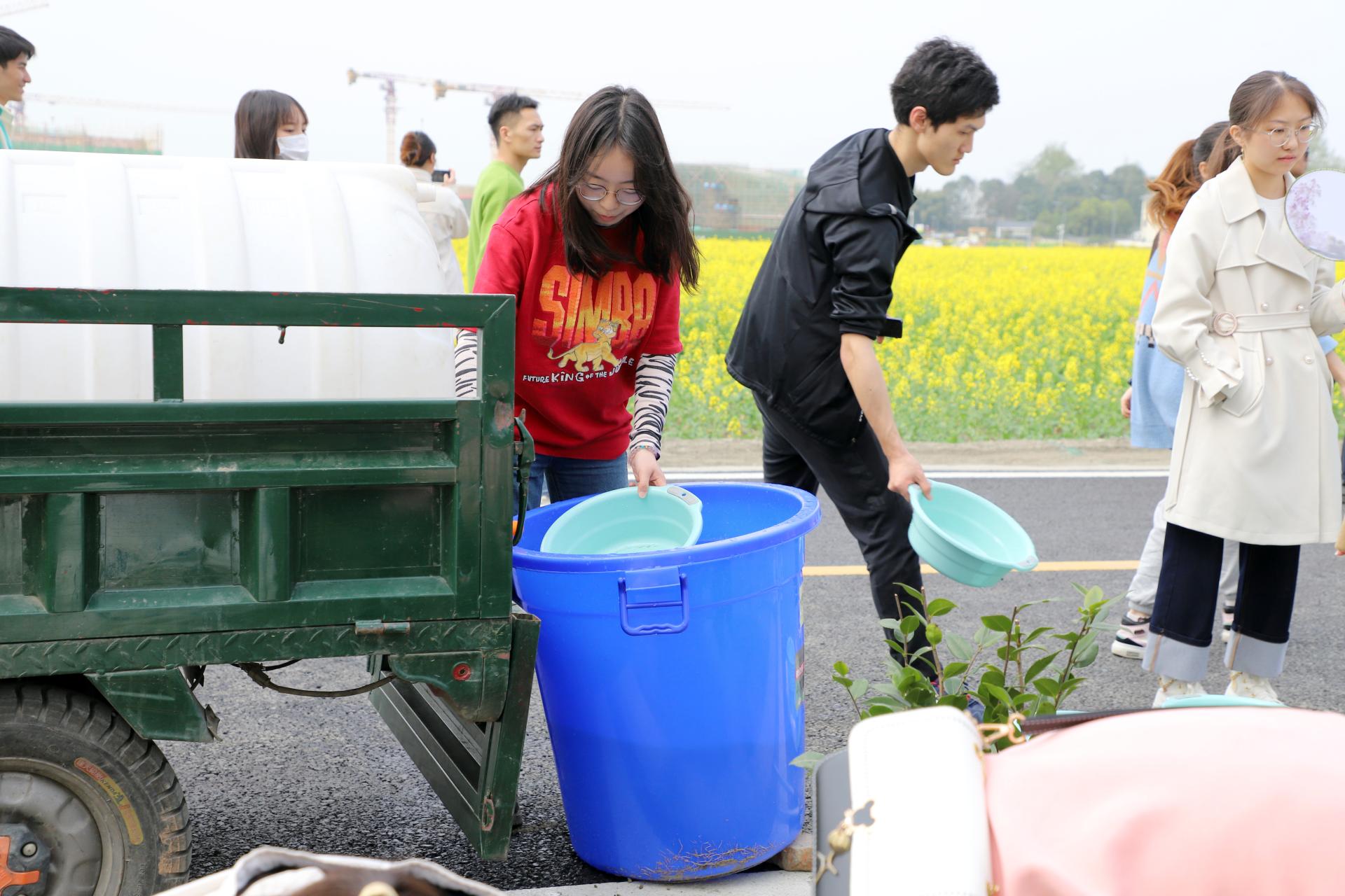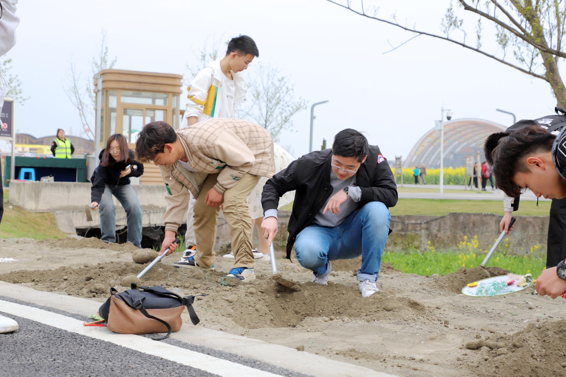 首先开展的是团扇制作活动。在老师的指导下,同学们利用胶水将各式各样的花朵按照他们对于春天的理解融合在扇面上。或娇媚,或明艳,或清冷,或热烈,同学们发挥着自身对于艺术的理解,将各自心中春天的印象留在素白的扇面上,制作成了一把把独家专属的春的记忆。接着,同学们来到种植树苗的地方,将准备好的树苗运送到目的地,挖坑、正苗、填土、浇水,相互合作,一起完成树苗的栽种,大家都深刻体会到照看树苗的不易和亲自栽种树苗的欢乐,现场气氛热闹。最后,同学们给自己种的树留下寄语,表达着内心美好的愿望和祝福,给予自己种的树苗专属的意义。