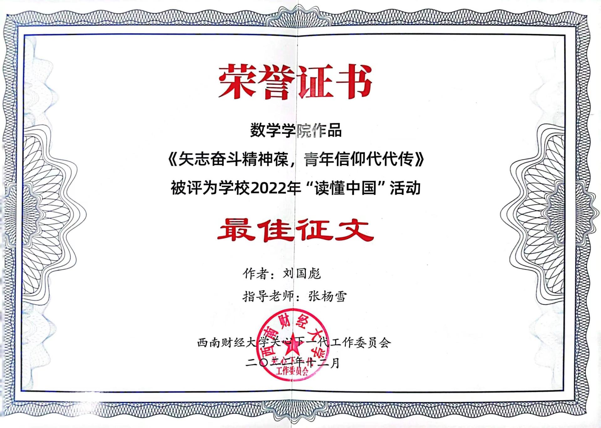 3月9日上午,公司在光华校区住友苑隆重召开关心下一代工作委员会换届大会,并对2022年“读懂中国”活动获奖员工和集体进行表彰。公司员工征文作品《矢志奋斗精神葆,青年信仰代代传》(作者:刘国彪,指导教师:张杨雪)获得公司2022年“读懂中国”活动最佳征文,同时,公司还获评公司2022年“读懂中国”活动优秀组织奖。