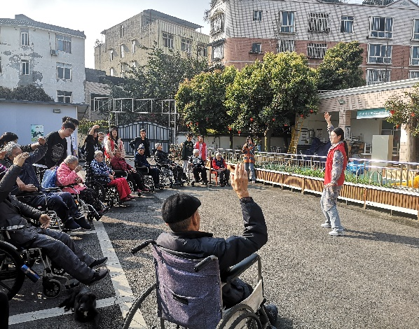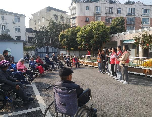 敬老院负责人简单介绍了老人们的具体情况和注意事项后,党建工作站副站长胡喜媚代表全体志愿者向老人们问好,并送上诚挚祝福。志愿者们合唱了精心准备的《国家》《唱支山歌给党听》《我和我的祖国》等老人们热衷的红歌,为他们献上了一段精彩的八极拳表演,引得大家掌声不断。现场还开展了手部活动和手部穴位按摩教学活动,志愿者“一对一”帮助老人们学习、理解和操作相关动作,并讲解了一些基础的健康养生知识。不少志愿者还用四川话给身边的老人“翻译”,以帮助他们更好地理解。