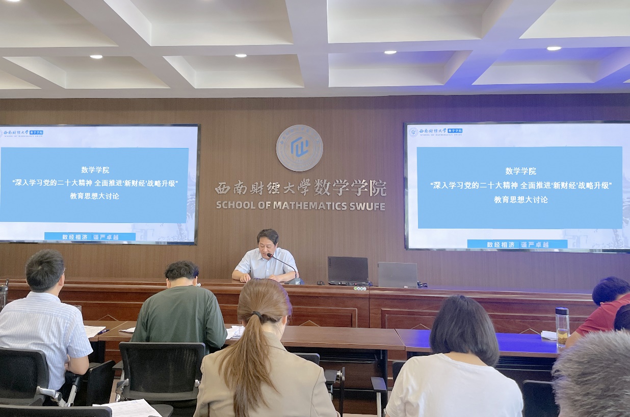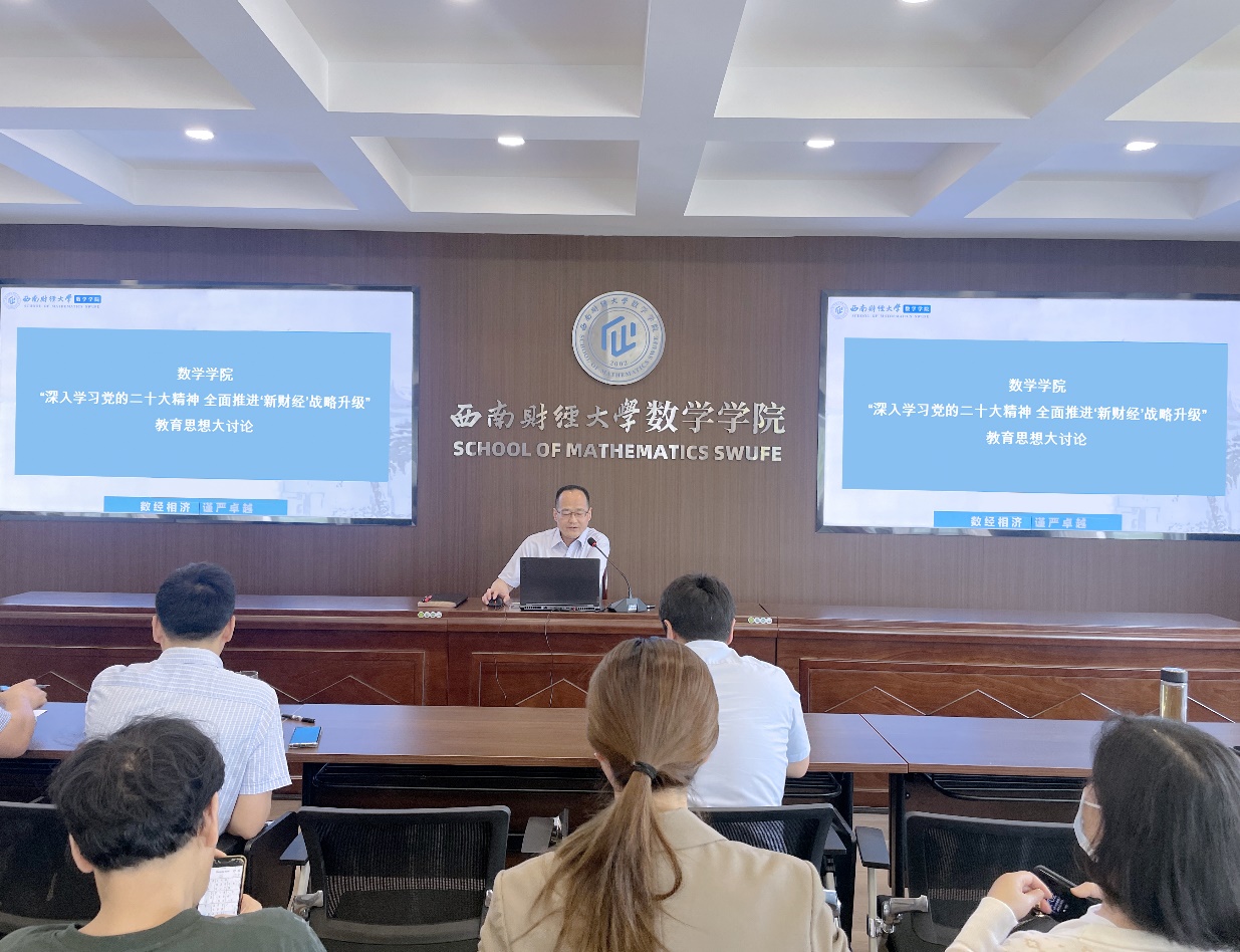 党委书记樊俊飞以《扎实开好“深入学习贯彻党的二十大精神 全面推进‘新财经’战略升级”教育思想大讨论 为加快建设财经特色鲜明的世界一流大学贡献数学力量》为题进行主题发言。他强调,全体教职工要立足历史交点、把握重要节点、做好周期盘点、站在更高起点,对“推动新时代高等财经教育创新发展”在认识上不断深入、战略上不断完善、实践上不断丰富,全面推进“新财经”战略升级。