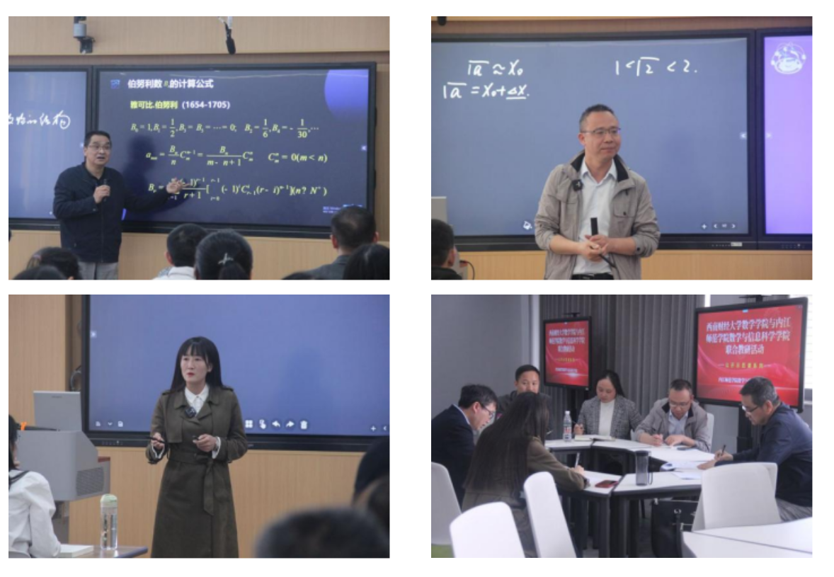 此次教研活动分为教学经验交流座谈会和公开示范课两个阶段。在教学经验交流座谈会上,双方围绕一流课程建设、学科竞赛、教学基层组织建设、教师教学能力提升四个方面展开了深入交流和探讨。在公开示范课阶段,戴岱老师为同学们讲授了《算法的概念》,生动有趣的教学方式使课堂氛围积极又融洽。内江师范公司的王新民老师采用了“导、讲、评、研”的教学模式,讲授了《归纳思想方法与贝努利数表》。内江师范公司的吕晓蝶老师以生活中的案例为载体,向同学们展示了事件独立性的概念及应用。此次公开示范课采用“线上+线下”同步直播的方式进行,共计2500余师生参加观摩学习。