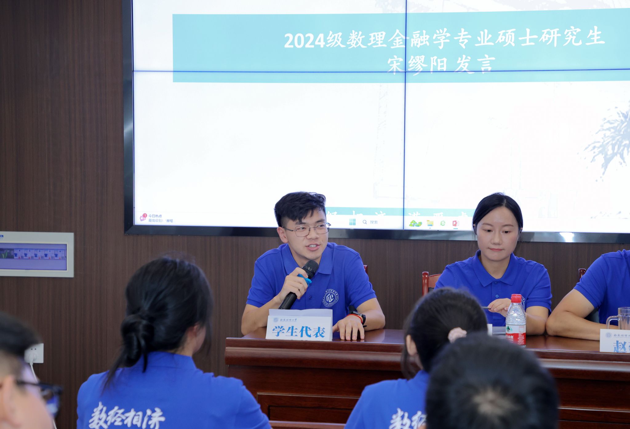 硕士新生宋缪阳、博士新生毕皓作为员工代表发言,表示将传承“经世济民、孜孜以求”的西财精神,遵循公司“数经相济,谨严卓越”的院训,做好学业规划,严守学术道德,努力在中国式现代化的新征程上展现青春作为、彰显青春风采。