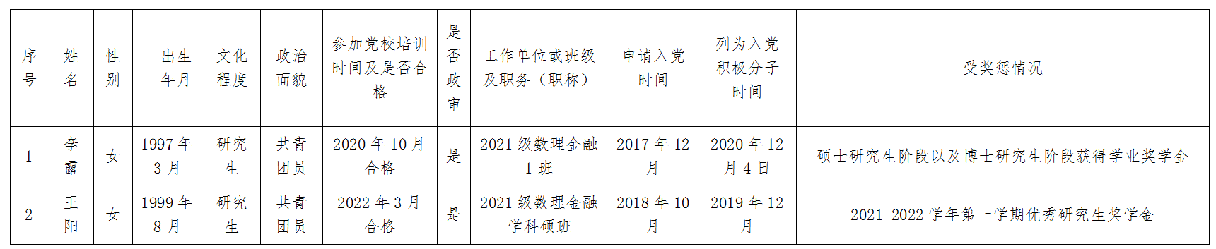 经党支部研究,拟将李露、王阳共2位同志发展为中共预备党员,现将其基本情况予以公示。在公示期内,欢迎广大党员、干部、群众通过信函、电话或直接到党支部或上级党委部门反映公示对象思想品质、现实表现、廉洁自律、培养教育等方面情况,公示时间为7天。