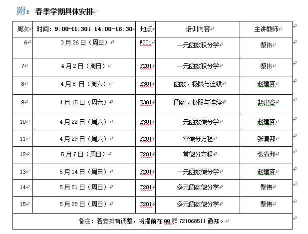 培训分为春季学期,暑假和秋季学期三个阶段,培训内容为非数学类竞赛大纲(预赛)内容以及数学类竞赛大纲(预赛)部分内容。现将春季学期的安排通知如下。