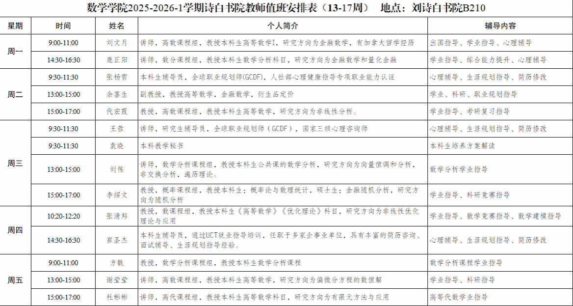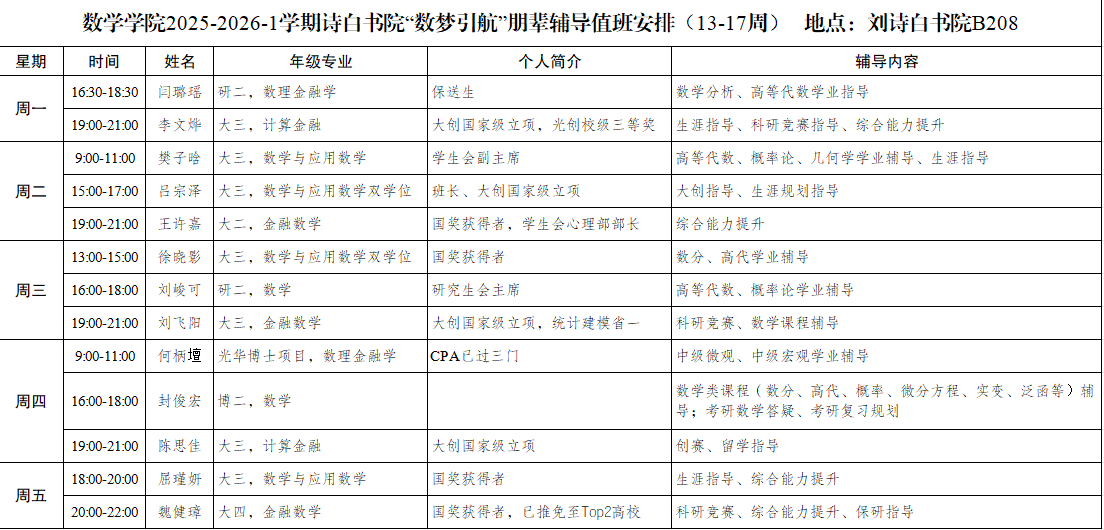 朋辈辅导值班安排如下: